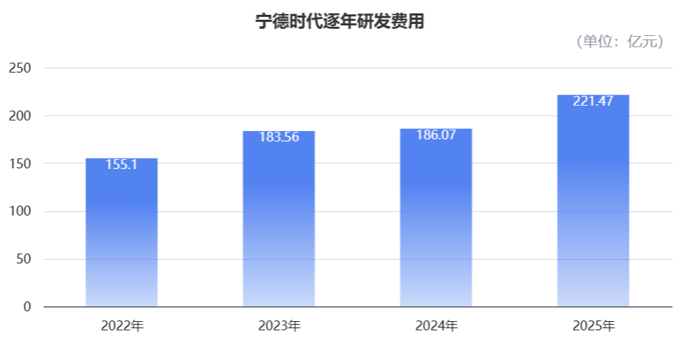 2025年,宁德时代的研发费用为221.47亿元,同比增长19.0%,占营收的5.23%。