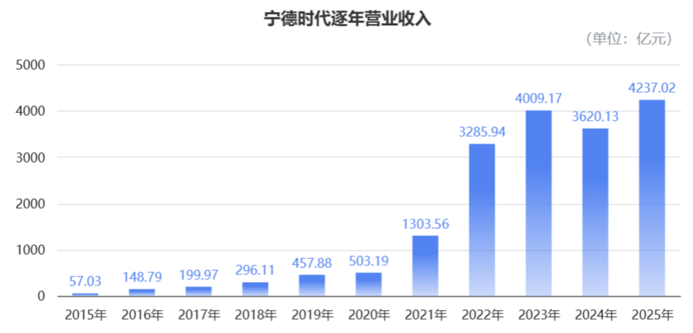 再整体来看全年,宁德时代2025年营业收入达到4237亿元,同比增长17.04%。