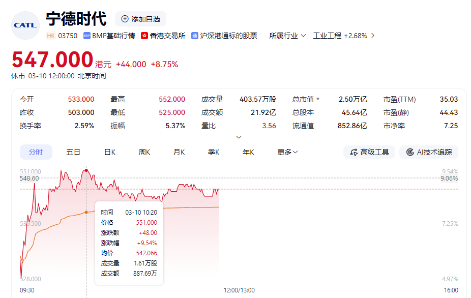截至发稿前,宁德时代A股股价最高涨超6%,港股股价一度涨超9%。