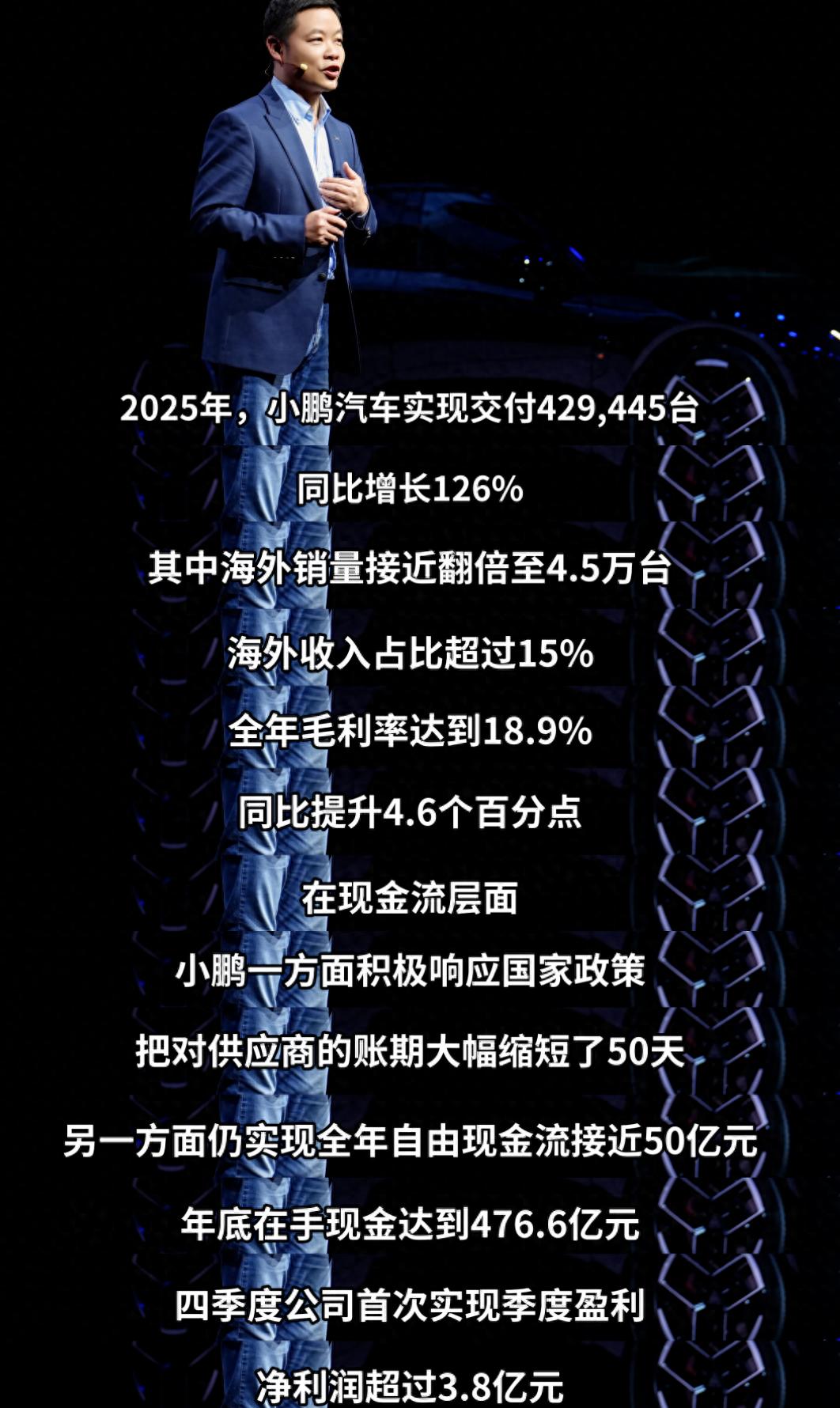 小鹏汽车CEO何小鹏今日在电话会议上透露,2025年,小鹏汽车实现交付429,445台,同比增长126%,其中海外销量接近翻倍至4.5万台,海外收入占比超过15%。在规模快速增长的同时,公司经营能力也同步提升:全年毛利率达到18.9%,同比提升4.6个百分点。
