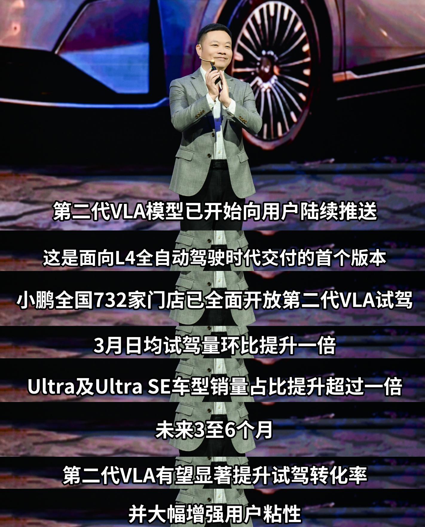 在用户侧,第二代VLA在安全性与体验上实现提升,高阶智驾正从“极客尝鲜”走向更广泛用户群体,变成妈妈都爱开的国民智驾。当前,小鹏全国732家门店已全面开放第二代VLA试驾,3月日均试驾量环比提升一倍,Ultra及Ultra SE车型销量占比提升超过一倍。
