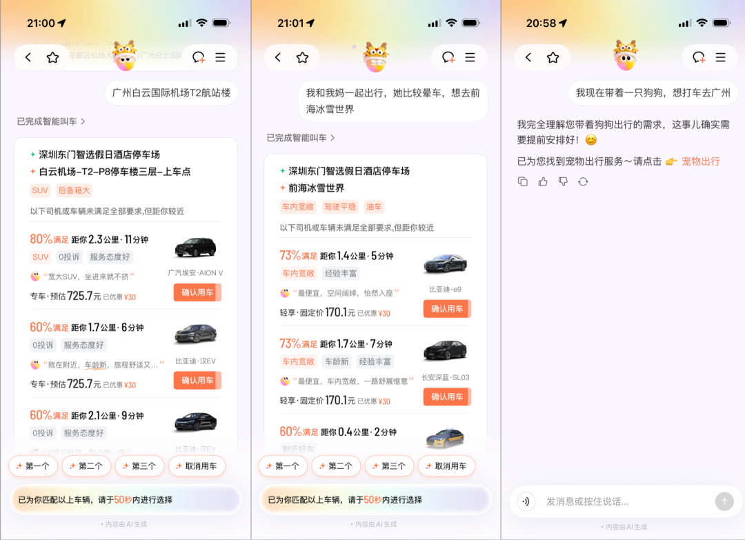 比如你说“身体不舒服”,它识别出“晕车”,通过“驾驶平稳”、“油车优先”匹配最合适的车;你说“带孕妇”,它优先安排“驾驶平稳”、“车内宽敞”的车;你说“去机场国际出发大厅”,它拆解成“后备厢大”的需求,给你放28寸的行李箱……像这样的服务标签,AI小滴一共支持90多个,覆盖扶老携幼、商务接待、多人出行等更复杂的出行场景。