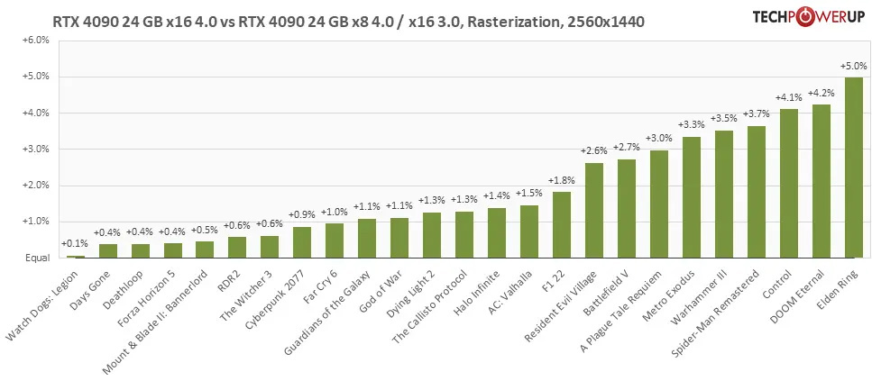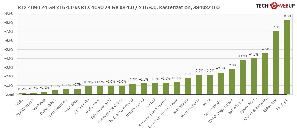 TechPowerUp 在 GeForce RTX 4090 GPU 和 Core i9-13900K CPU 平台上,测试了包括《艾尔登法环》和《孤岛惊魂 6》一些支持光线追踪的新游戏,显示 Gen4 x16 和 x8 模式性能差异很小,其中差别最大的是《孤岛惊魂 6》,达到了 8.3%。
