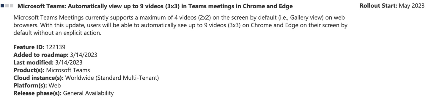 在 Microsoft 365 路线图页面上,微软提到将在 5 月份将 3x3 视频视图设为 Teams for web 浏览器的默认设置。微软还提到,Chrome 和 Edge 浏览器将支持自动查看多达 9 个视频窗口 (3x3),但没有详细说明其他网络浏览器是否支持该特性。