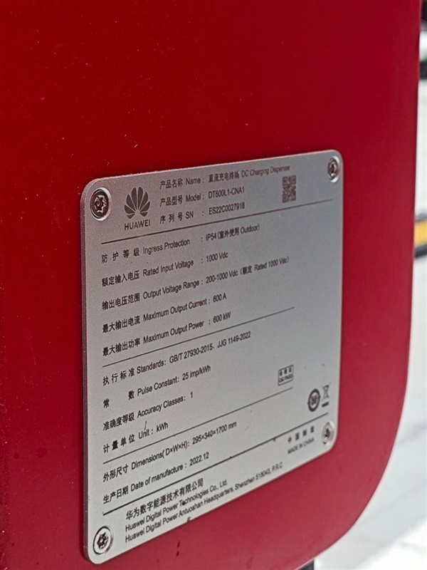 近日,网络上曝光了一组疑似华为超快充桩的图片,最大输出功率达 600kW。