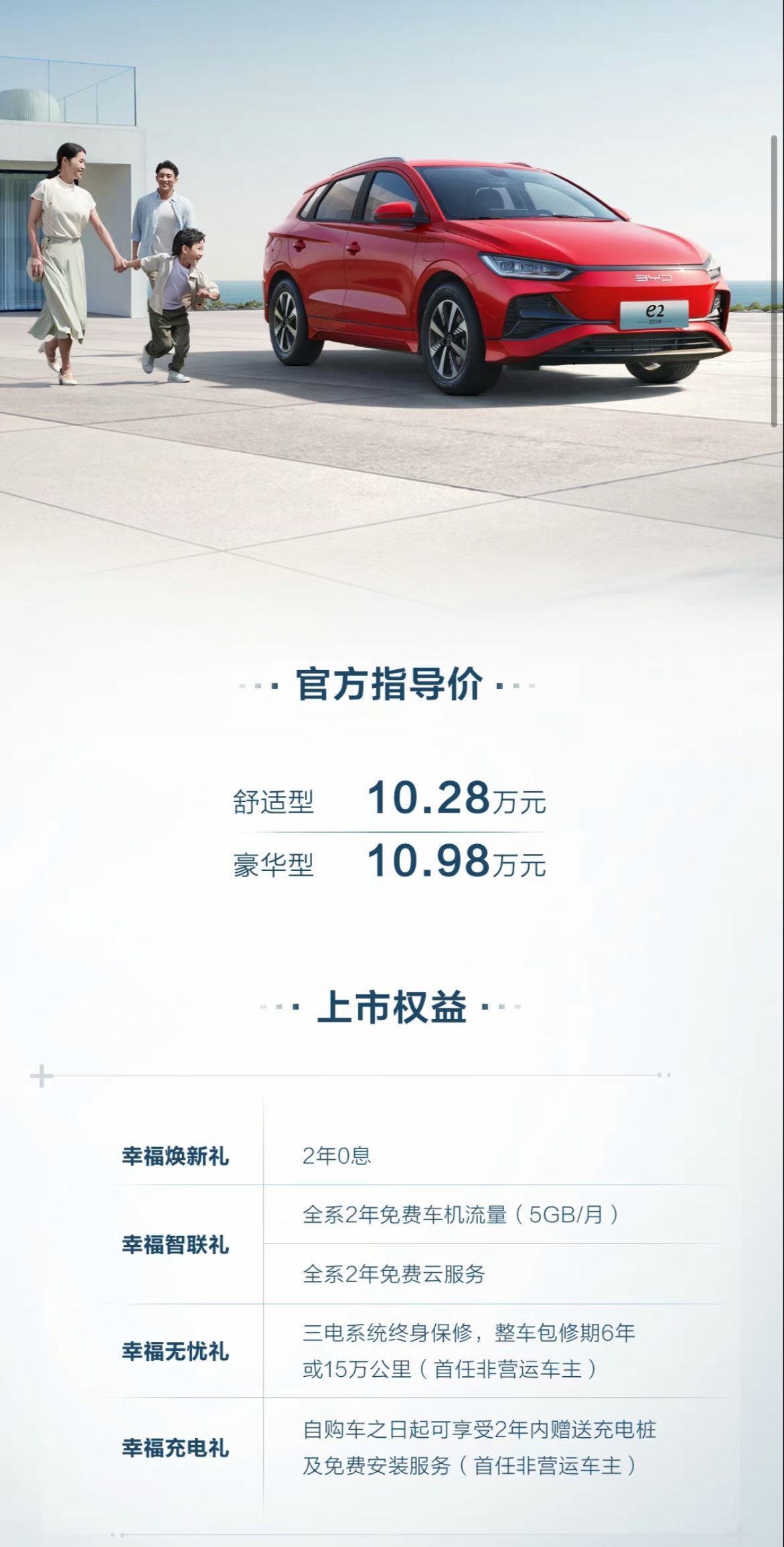 IT之家 4 月 6 日消息,比亚迪官方宣布 2023 款比亚迪 e2 今日正式上市,共有舒适型和豪华型两种型号可选,售价分别为 10.28 万元和 10.98 万元。