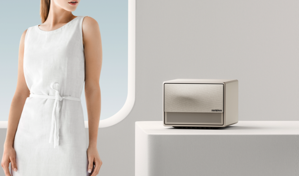 设计方面,极米 RS Pro 3 承袭极米 RS 系列的曲线之美,并带来了全新极米灵动家居美学。机身采用了薄雾金配色,以 NAPPA 皮革、FlowCover 织物蒙布和金属三种材质碰撞组合,辅以弧线化的设计。