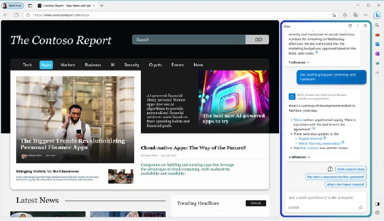 除了在 Windows 11 加入 Copilot 之外,微软还在 Edge 浏览器引入了 365 Copilot 功能。这是首个原生支持 AI 的浏览器。Edge 浏览器的侧边栏会出现 Copilot 工具图标,对用户正在浏览的网页内容进行分析,帮助用户生成 Word、Excel 等 Windows 365 文档,或用于撰写 Outlook 邮件。
