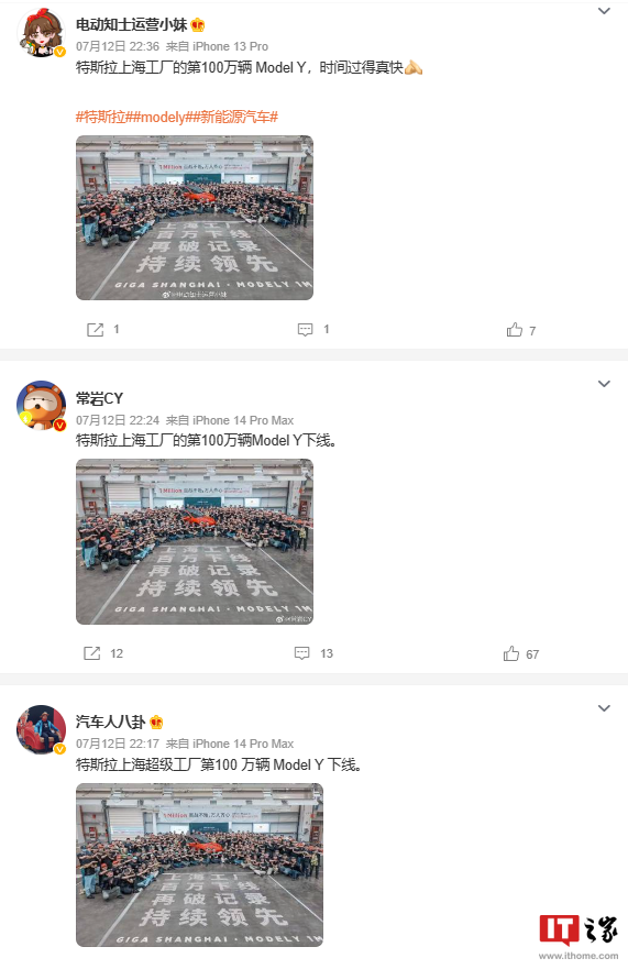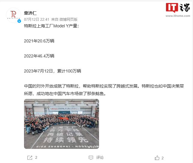 汽车博主 @童济仁 表示,特斯拉上海工厂在 2021 年生产了 20.6 万辆 Model Y,2022 年生产了 46.4 万辆,截至 2023 年 7 月 12 日已累计生产 100 万辆。