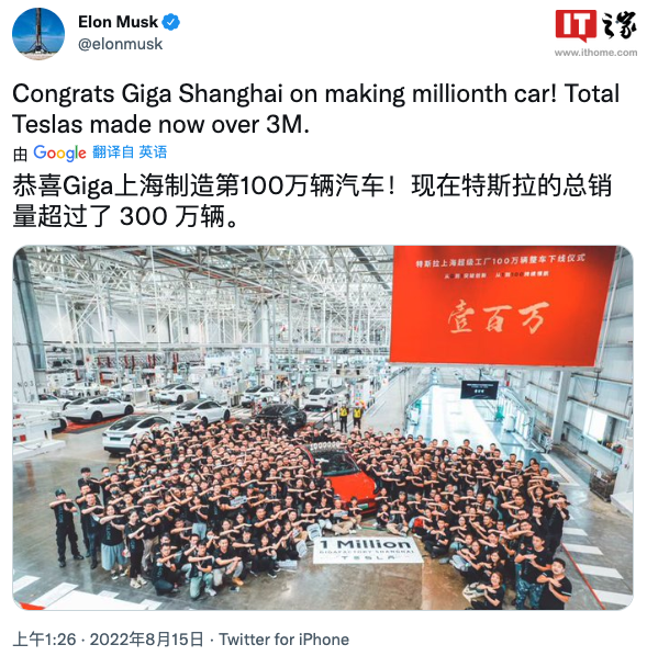 IT之家此前报道,2022 年 8 月 14 日,特斯拉公司 CEO 埃隆・马斯克 (Elon Musk) 在其推特上称,特斯拉已生产了逾 300 万辆汽车,其中上海超级工厂就生产了 100 万辆。