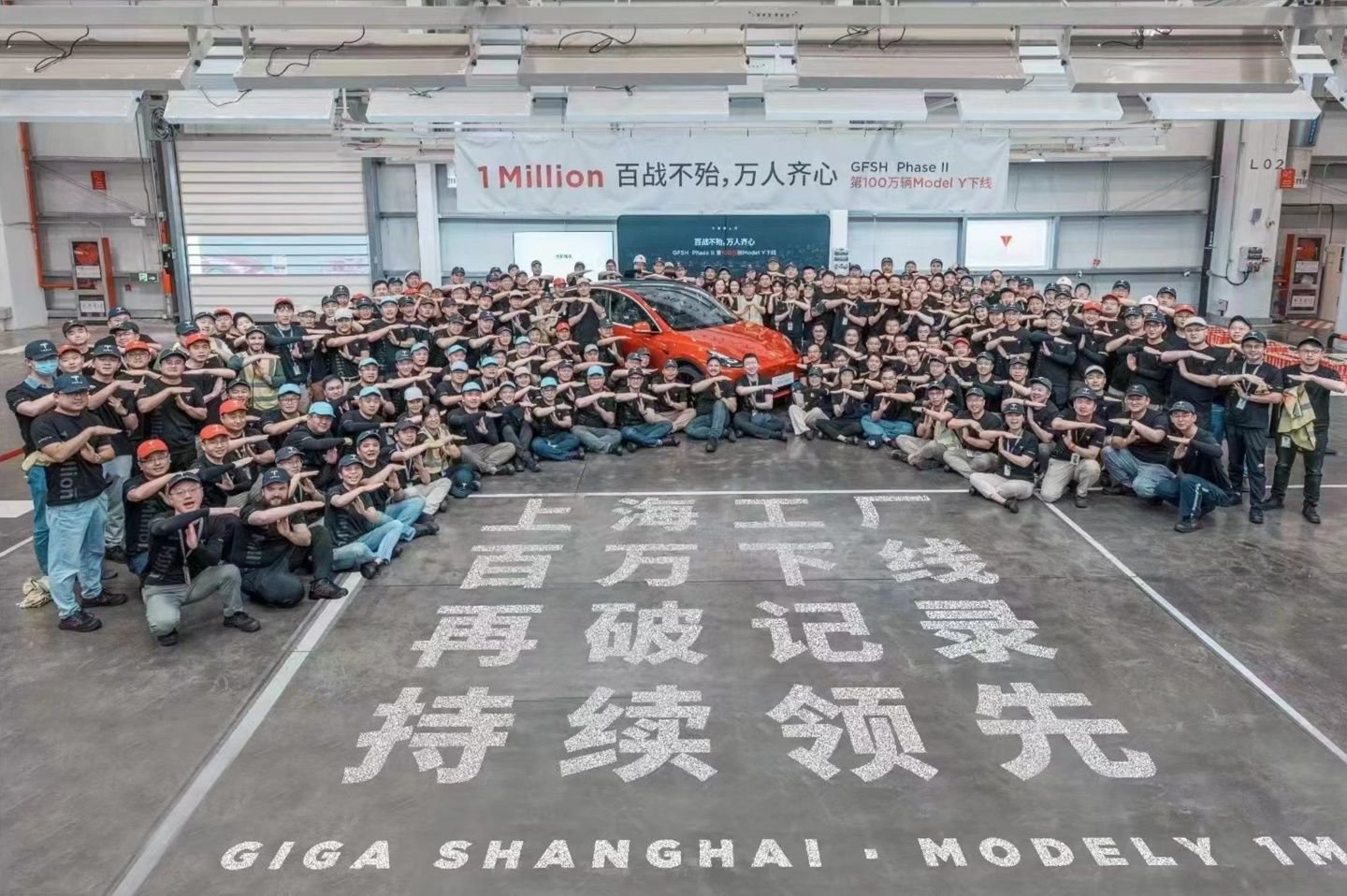 IT之家 7 月 13 日消息,日前有多名汽车博主发布消息称,特斯拉上海超级工厂第 100 万辆 Model Y 下线。从照片中可以看见,该工厂国内外员工正围绕一辆红色的 Model Y 拍摄合影,背景挂有“1 Million 百战不殆,万人齐心”的横幅,地面上也覆盖了“上海工厂百万下线,再破记录持续领先”的字样。