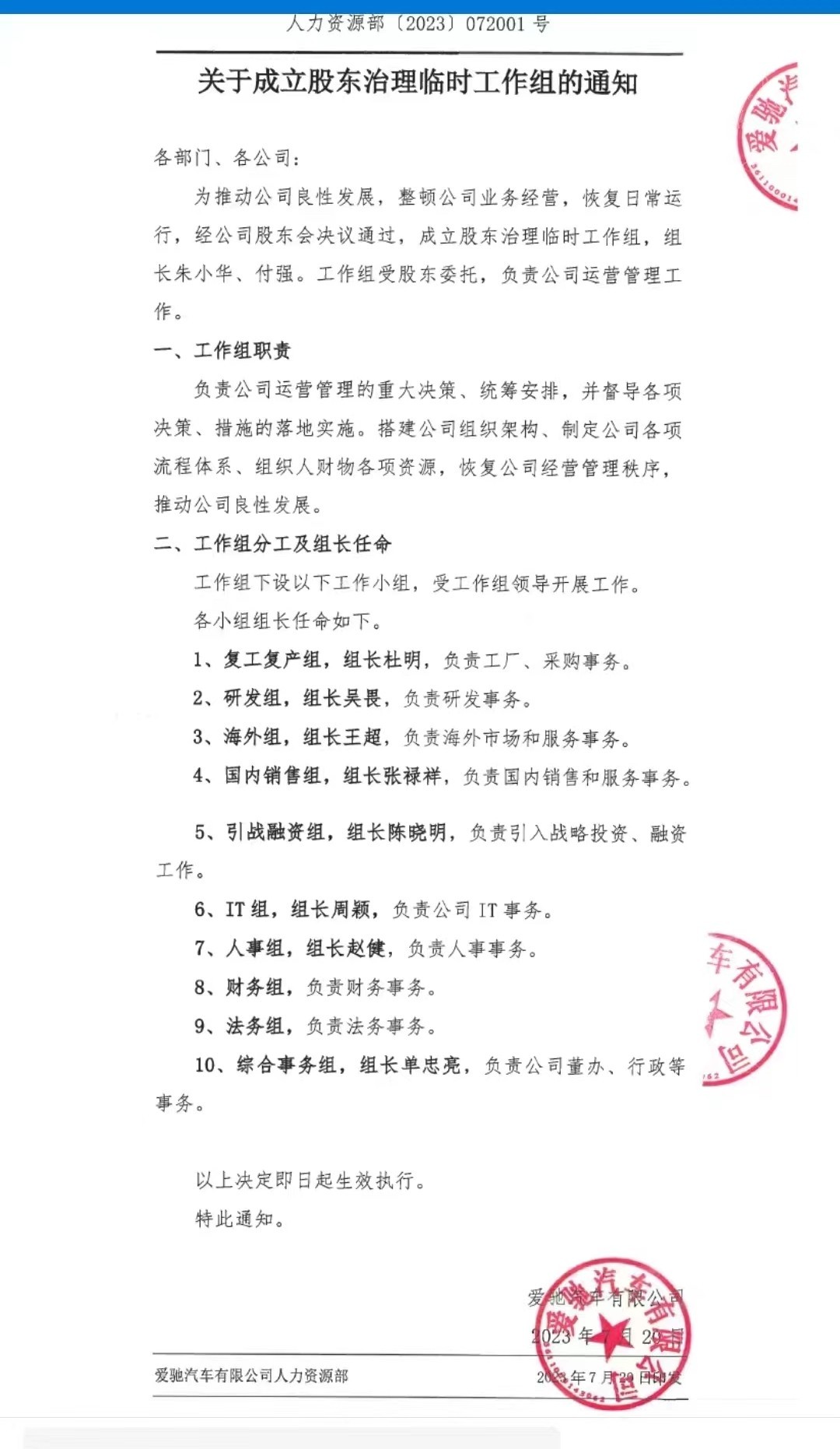 IT之家 7 月 21 日消息,7 月 20 日,爱驰汽车发布《关于成立股东治理临时工作组的通知》。文件显示,此次成立的临时工作组包含复工复产组、研发组、海外组、国内销售组、引战融资组(IT之家注:“引入战略投资”的简称)、IT 组、人事组、法务组等 10 个工作小组。这意味着此前已停工、停薪时长数月的爱驰汽车,将迎来复工复产。