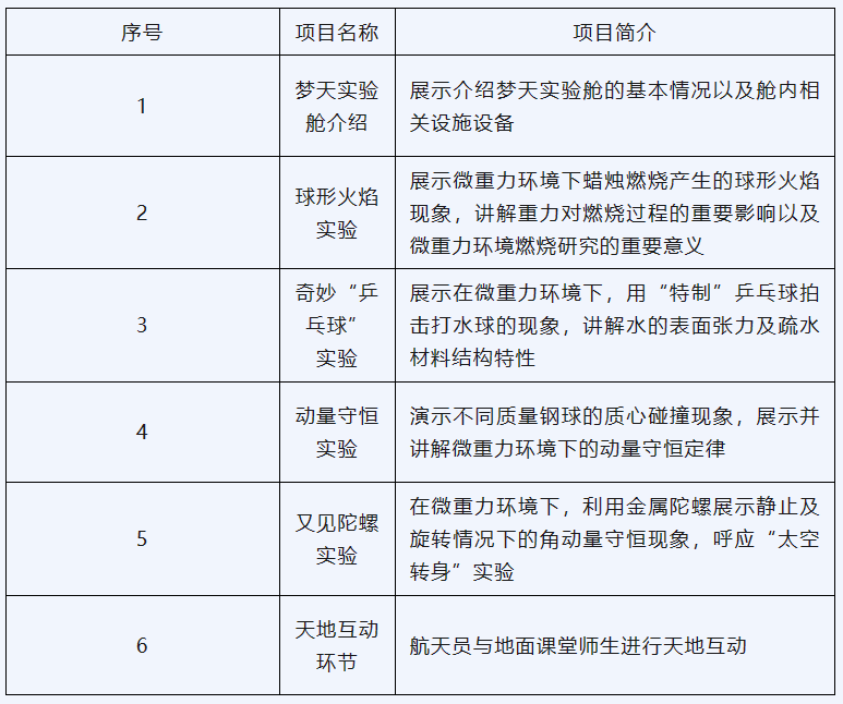 据介绍,本次太空授课活动继续采取天地互动方式进行。3 名航天员将在轨展示介绍中国空间站梦天实验舱工作生活场景,演示球形火焰实验、奇妙“乒乓球”实验、动量守恒实验以及又见陀螺实验,并与地面课堂进行互动交流。