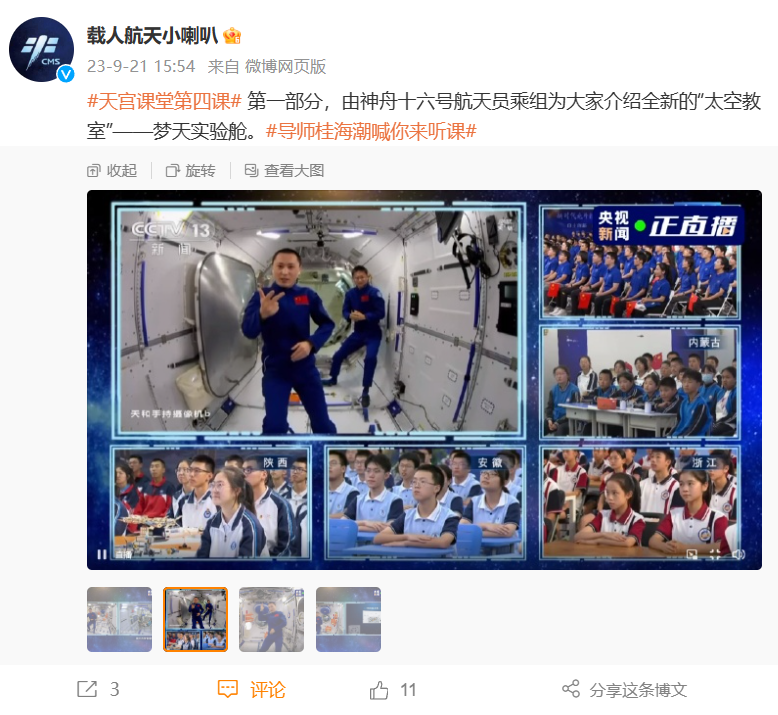 IT之家 9 月 21 日消息,今日下午 15 时 45 分,中国空间站“天宫课堂”第四课正式开讲。神舟十六号航天员景海鹏、朱杨柱、桂海潮将面向全国青少年进行太空科普授课,中央广播电视总台面向全球现场直播。