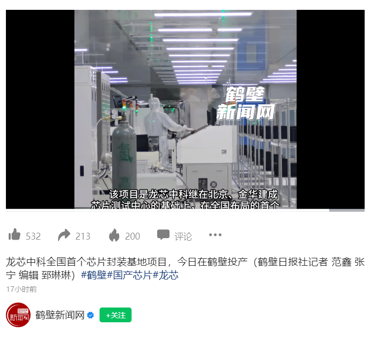 IT之家 10 月 13 日消息,据鹤壁日报报道,10 月 12 日下午,龙芯中科芯片封装基地项目投产仪式在鹤壁科创新城举行。龙芯中科芯片封装基地位于鹤壁科创新城百佳智造产业园,是龙芯中科在全国布局的首个芯片封装项目。