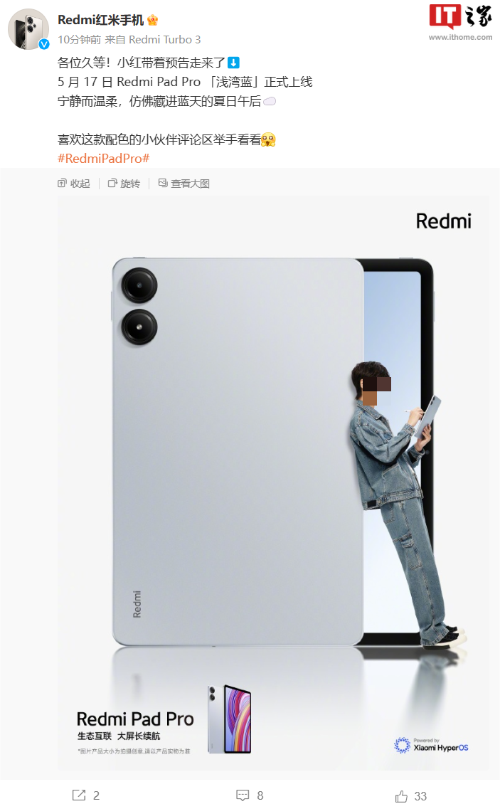 IT之家 5 月 15 日消息,小米 Redmi 品牌今日官宣旗下 Redmi Pad Pro 平板电脑将于 5 月 17 日上线配色“浅湾蓝”。