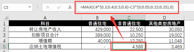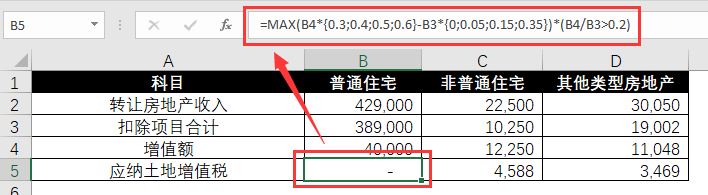 该与非普通住宅公式的区别在于,增加了逻辑判断式 B4 / B3>0.2,来判断增值率是否大于 20%。