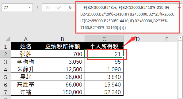 =IF(B2<3000,B2*3%, IF(B2<12000,B2*10%-210, IF(B2<25000,B2*20%-1410, IF(B2<35000,B2*25%-2660, IF(B2<55000,B2*30%-4410, IF(B2<80000,B2*35%-7160, B2*45%-15160))))))