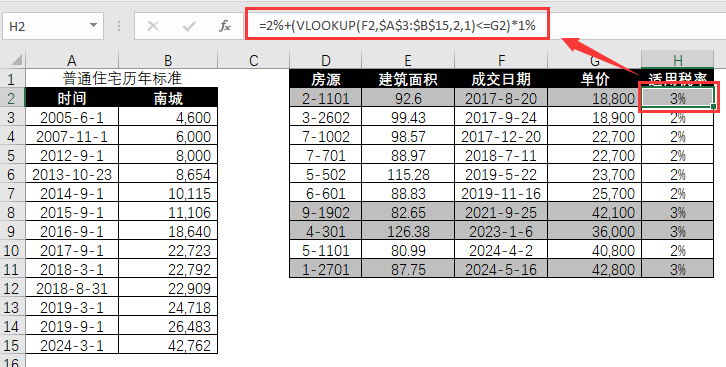 =2%+(VLOOKUP(F2,$A$3:$B$15,2,1)<=G2)*1%