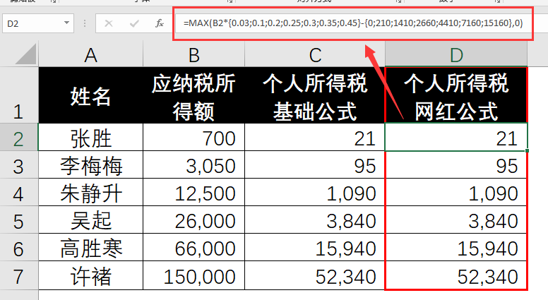 最后再通过 MAX 函数取其最大值,即可得出最终个税。