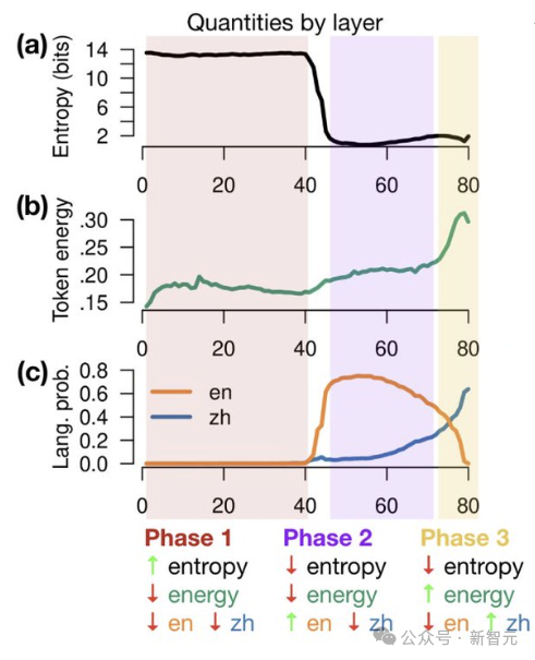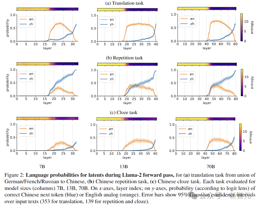 上图表示 Llama-2 前向传递期间,每一层输出是英语还是中文的概率,三个任务分别为:(a)从德语 / 法语 / 俄语到中文的翻译任务,(b)中文重复任务,(c)中文完形填空任务。