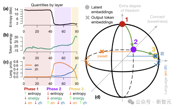 最后,第 3 阶段沿赤道旋转到目标语言的半球,产生输出 token。