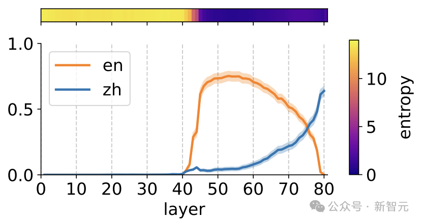 而下图的统计显示:在 Llama2 的大部分前向传递中,正确中文 token(蓝色)的概率远低于英文翻译(橙色)的概率。中文只在最后两层中占据主导地位。