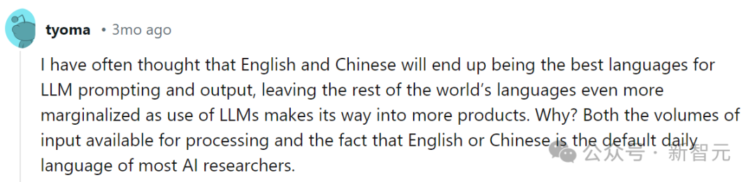 「英语和中文最终将成为 LLM 提示和输出的最佳语言,而随着 LLM 的应用范围越来越广泛,世界其他语言将更加边缘化。」