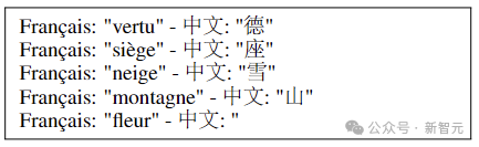 将前面的非英语(例如法语)单词翻译成中文,示例如下,向模型展示四个单词,并带有正确的翻译,后跟第五个没有翻译的单词,让模型预测下一个 token: