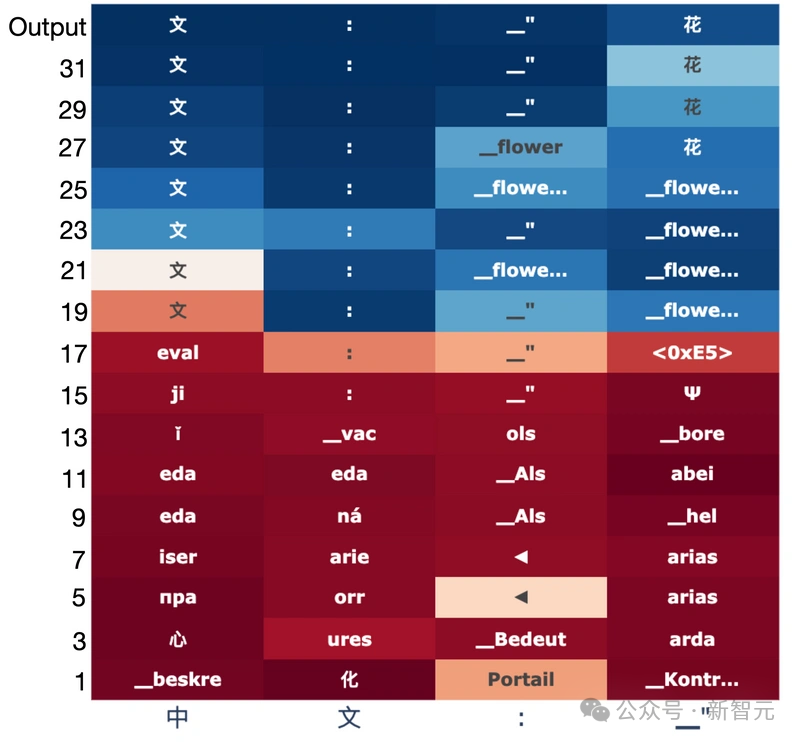于是,我们能在上图清楚地看到,羊驼在得到中文翻译(「花」)时的整个推理过程。