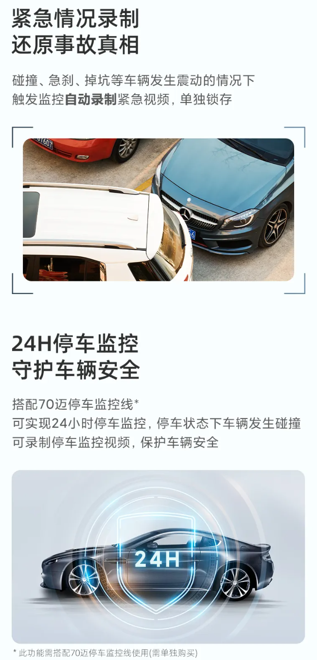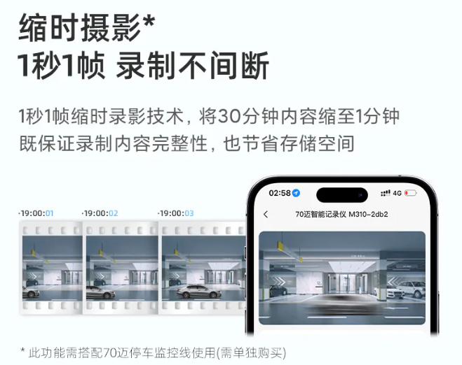 M310 支持紧急情况录制,在碰撞、急刹、掉坑等情况下,将触发监控自动录制紧急视频,单独锁存;搭配 70 迈停车监控线,可实现 24 小时停车监控;支持 1 秒 1 帧缩时录影技术,30 分钟内容可缩短至 1 分钟。
