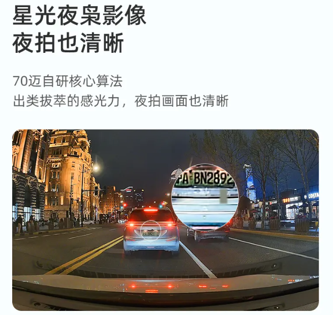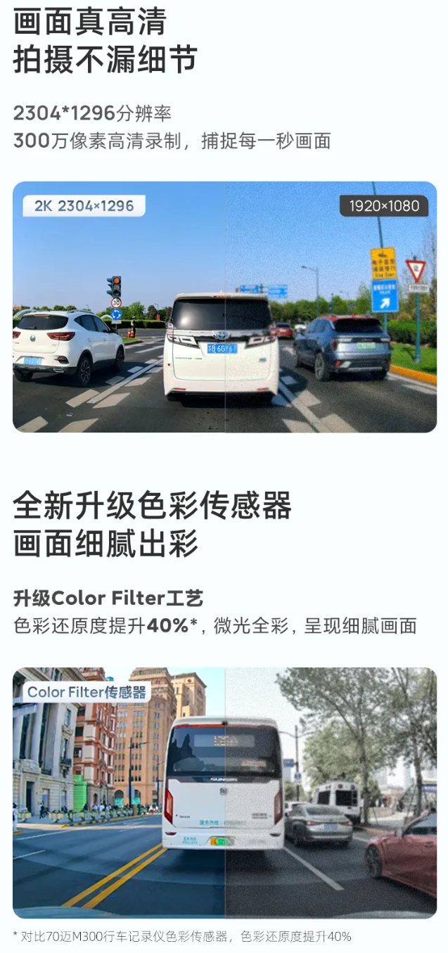 70 迈 行车记录仪 M310 支持 2304×1296 分辨率 300 万像素录制;升级 Color Filter 工艺,官方表示色彩还原度相比 M300 提升 40%,支持微光全彩;支持夜枭影像,夜间画面清晰度得到提升。