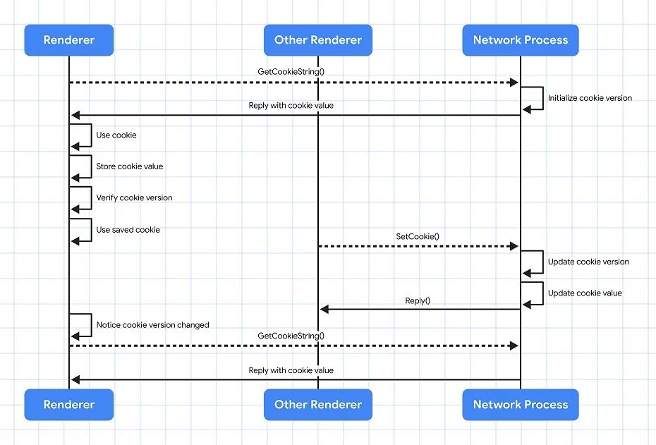 网络服务将每个 document.cookie 的版本保存在共享内存中。因此,渲染器无需向网络服务发送进程间查询,就能知道自己是否拥有最新版本。
