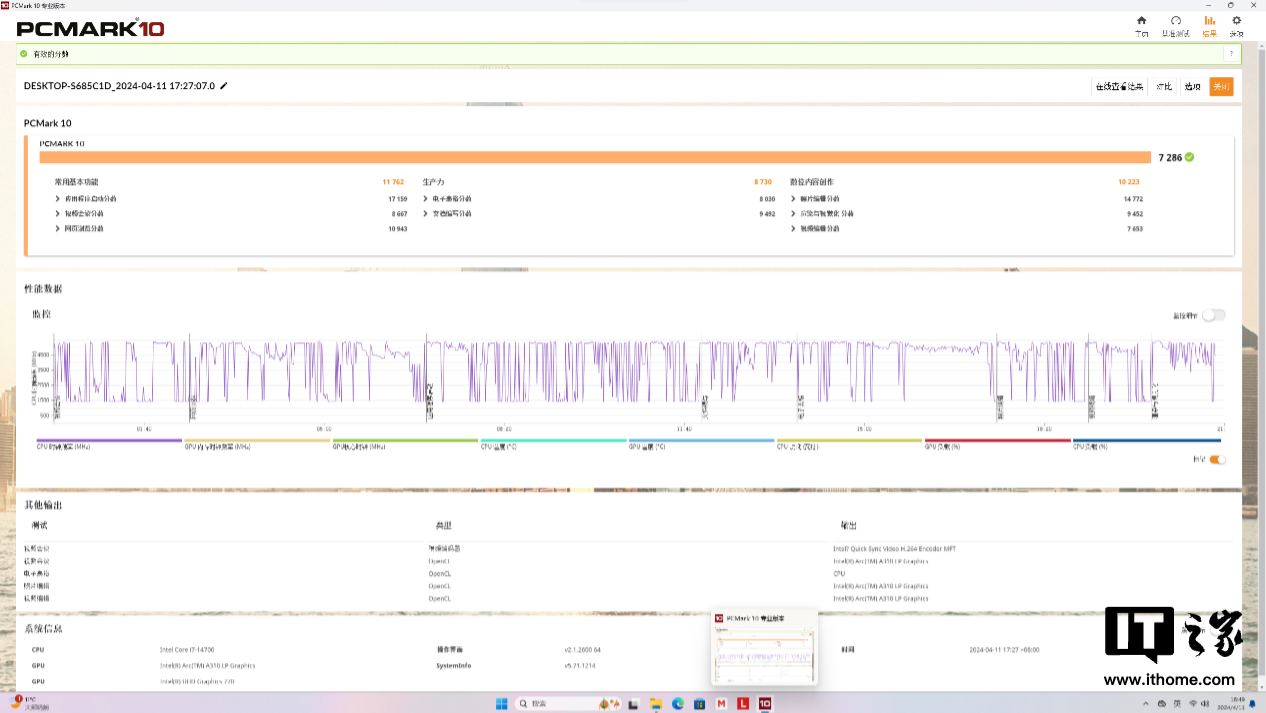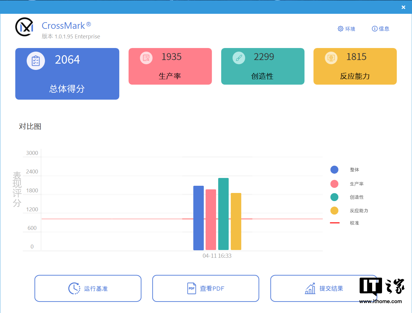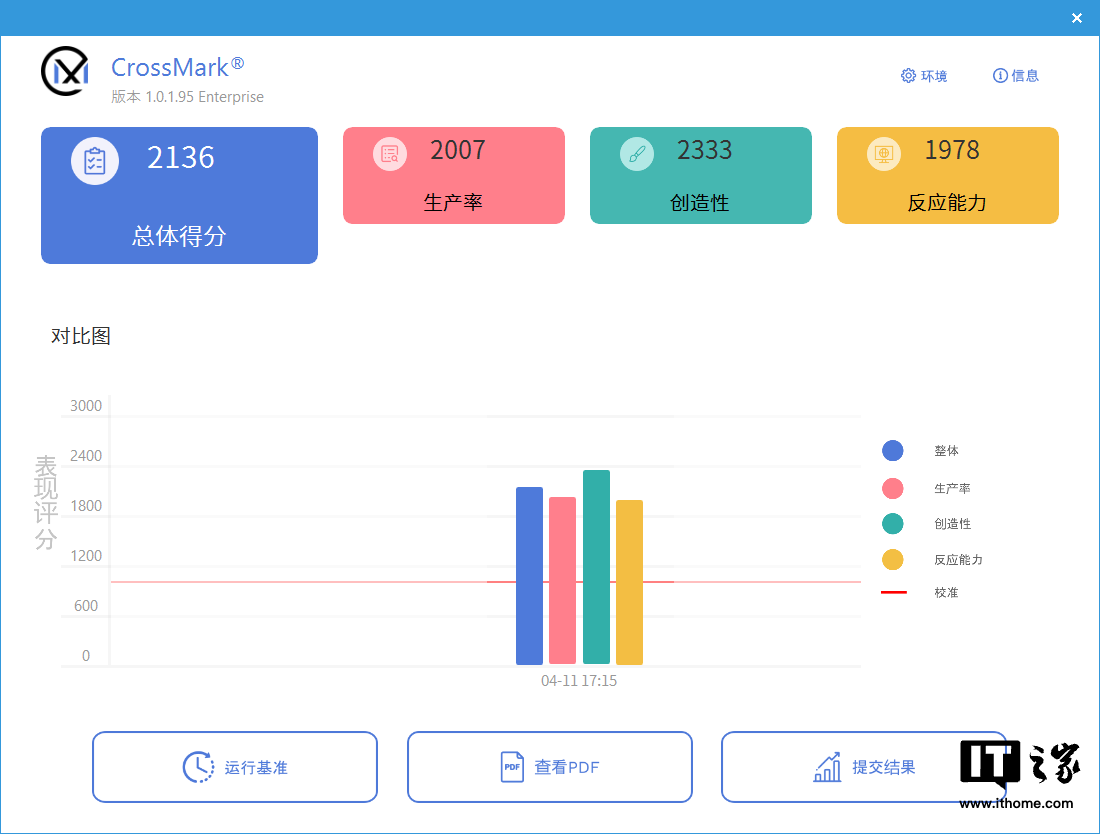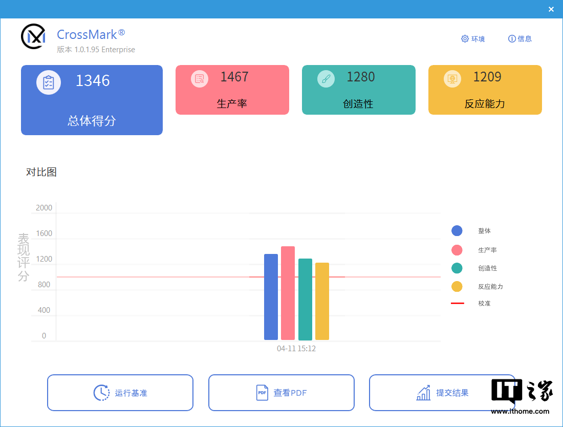 测完 CPU 理论性能和散热表现,我们也跑了两项针对日常办公的基准测试,在 Cross Mark 基准测试中,ThinkCentre M760q 总分 1346 分,生产率子分数最高。