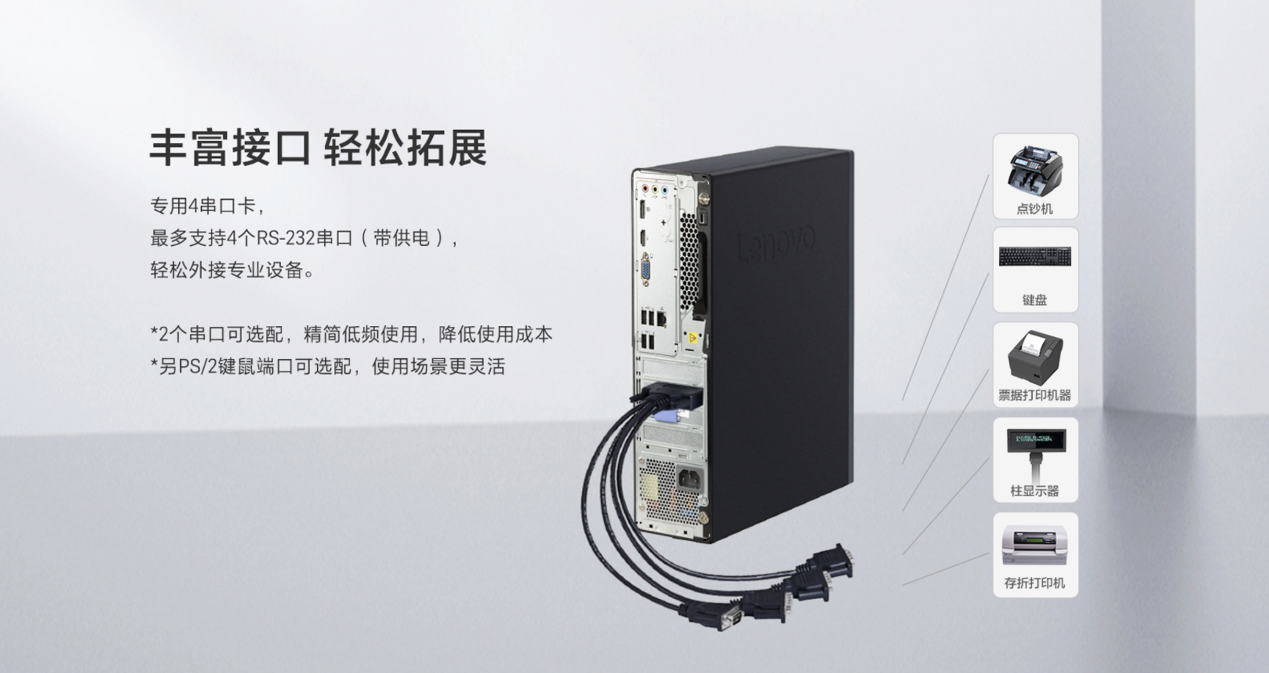 当然,最关键的地方其实在下面的 PCIe 开槽部分,ThinkCentre M760s 可以提供一个专用的 4 串口卡,可以借助一根 1 转 4 的 RS-232 串口转接线,连接很多行业的专有串口设备,比如点钞机、票据打印机、立柱式电子屏、存折打印机之类的设备,胜任超市等收银柜台,银行服务台等使用场景,算是官方为这台电脑提供了精准的就业技能。