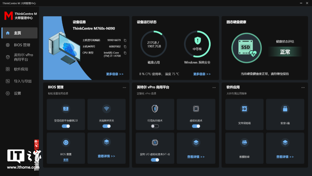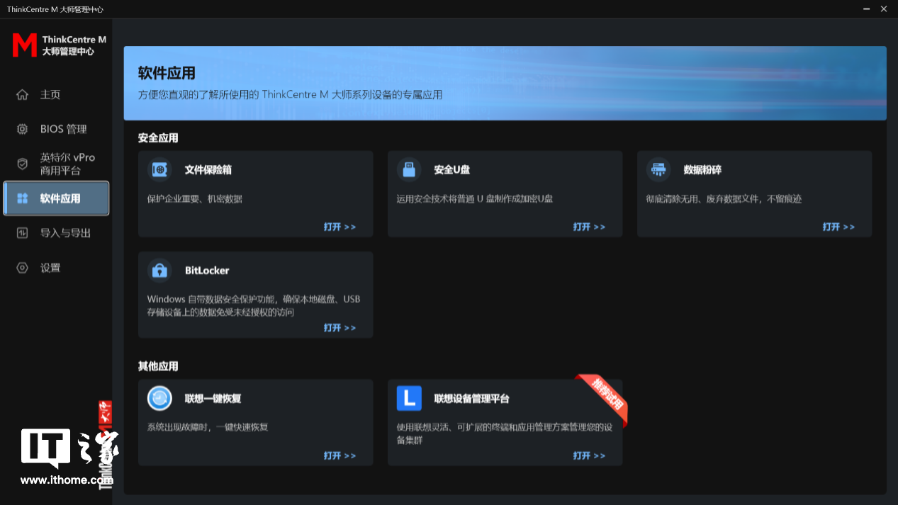 最后稍微聊聊 ThinkCentre M 大师系列专属的管理软件,其实就类似于大家平常电脑上用到的控制中心。不过,ThinkCentre M 大师管理中心还汇聚了不少专业的商用定制功能,这些功能实用性非常强,咱们一起来看看。