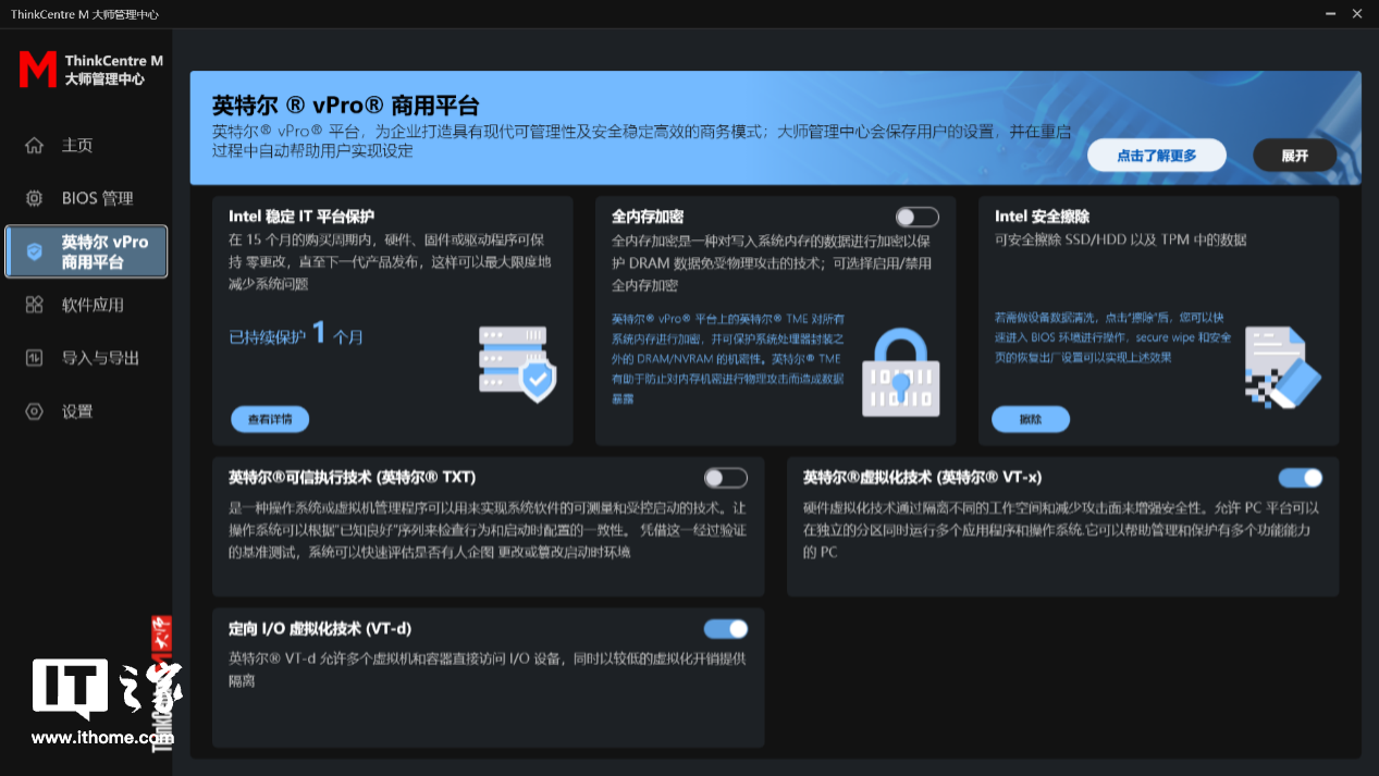 第三个标签页,也就是英特尔 vPro 商用平台的定制功能,专业性就比较强了,其中包含了全内存加密、Intel 硬盘 / TPM 数据完全擦除、硬件虚拟化等技术,对用户的数据隐私保护起到了至关重要的作用。