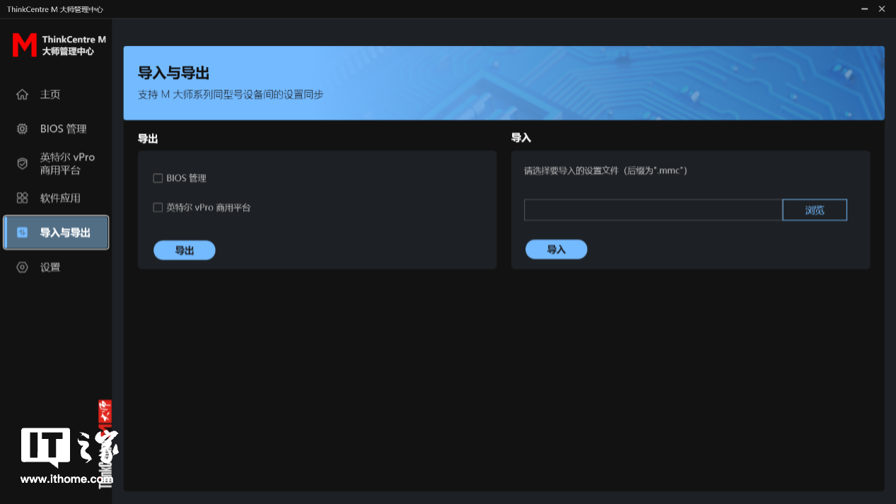 而第五个标签页中的导入与导出功能同样非常实用,它可以将 ThinkCentre M 大师管理中心中的设置参数和配置导出为文件,并且同步到其它 M 大师系列的设备上,非常适合企业用来做批量设备部署。