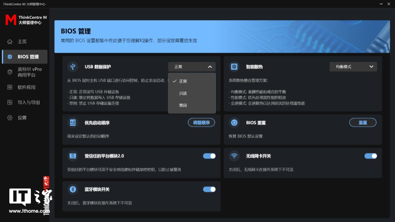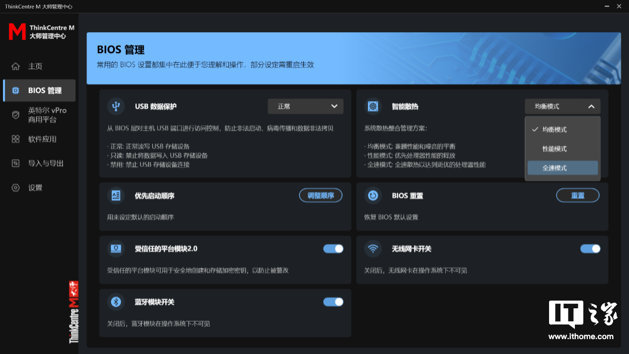 在 BIOS 管理标签页中,用户可以设置 USB 外接设备的数据读取方式,选择禁用则无法读取 / 修改任何数据。顺带一提,ThinkCentre M 大师管理中心支持启动密码,这样可以有效防止其它人修改其中的设置和选项。右侧的性能模式前面提到过,这里不再赘述。