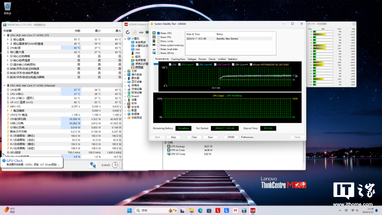 然后是 AIDA64 烤机测试,体积最小的 ThinkCentre M760q 单烤 CPU 项目,CPU 功耗稳定在 36W,CPU 稳定 57 度,P 核最高频率 3.4GHz,最低频率 798MHz。