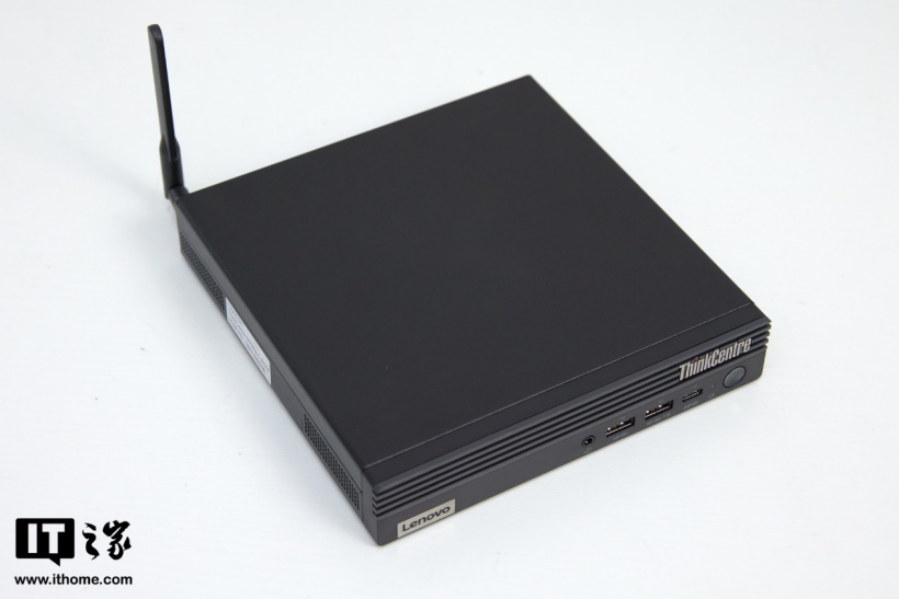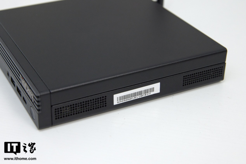 只看这个 1L 体积的小机箱,它的外观做得非常低调内敛,除了前面板采用了 ThinkCentre 系列标志性的瀑布格栅设计和经典的 ThinkCentre Logo 标、Lenovo 铭牌,其它部分都是纯黑金属材质,没有多余装饰。机身左右两侧各有一组散热孔,底部还有四个小脚垫,至此它的外观就介绍完了。