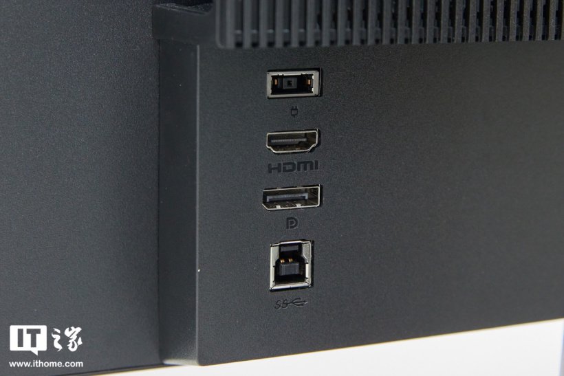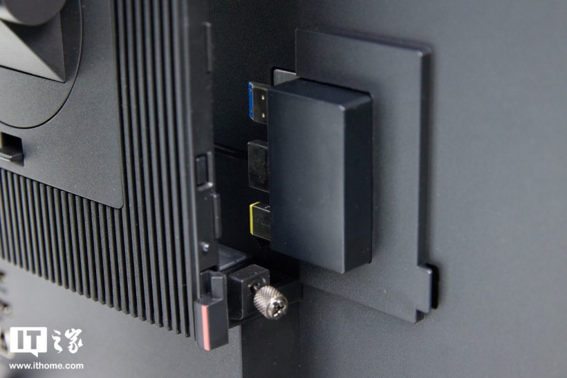 在这台专为 ThinkCentre M760q 所准备的显示器背部,有一个小的转接坞,装入小机箱时正好对应上机箱背面最左侧三个接口。