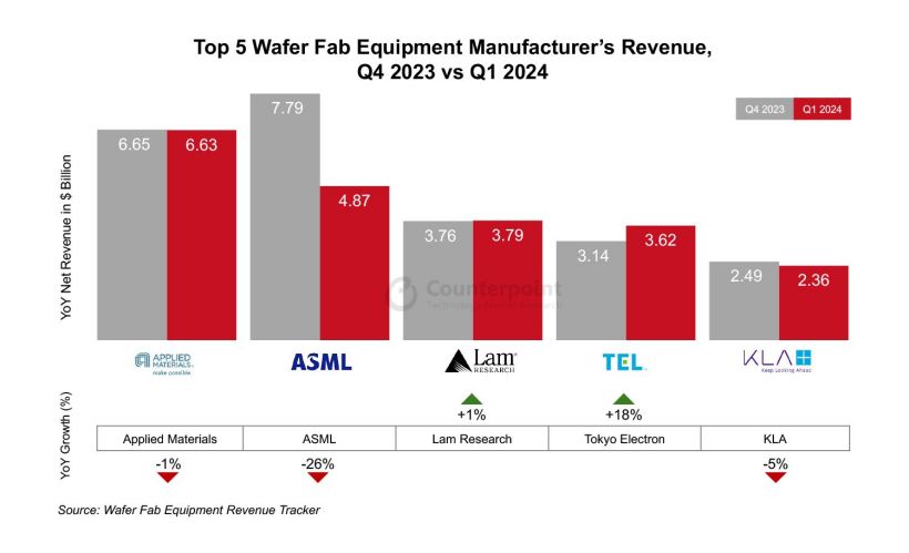 IT之家注:在前五名中,ASML 收入环比分别下降 21%、同比下降 26%,KLA 环比下降 14%,同比下降 5%。与 2023 年相比,应用材料公司、Lam Research 公司和 KLA 公司的收入环比降幅为个位数。