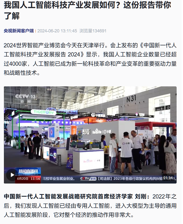 IT之家 6 月 20 日消息,IT之家从央视新闻获悉,2024 世界智能产业博览会今天在天津举行,《中国新一代人工智能科技产业发展报告 2024》发布。