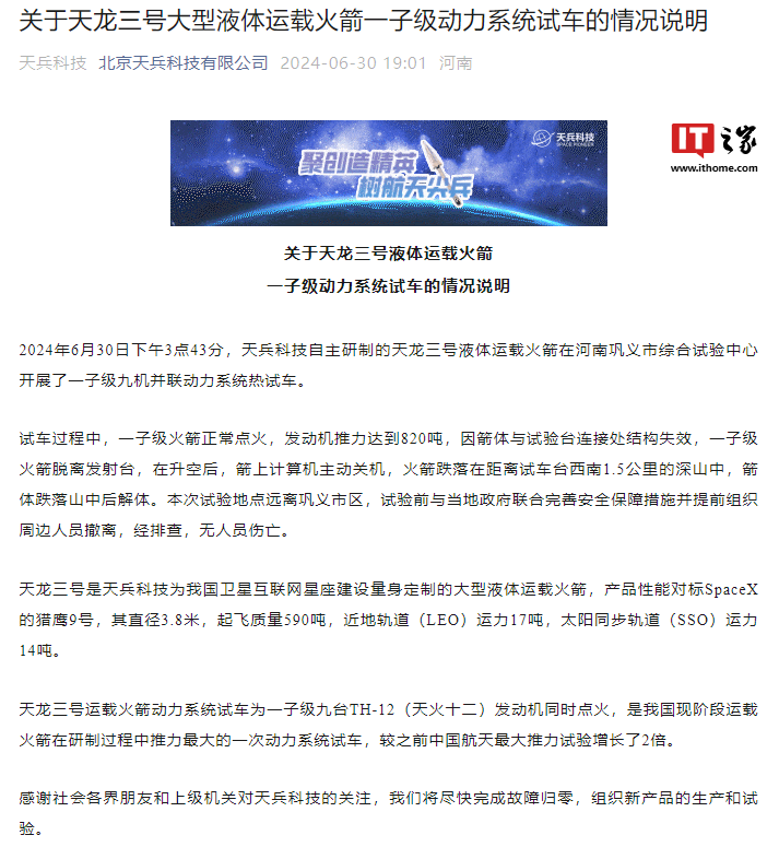 IT之家 6 月 30 日消息,针对网传“天兵科技火箭坠落起火”一事,北京天兵科技有限公司今日发布“关于天龙三号大型液体运载火箭一子级动力系统试车的情况说明”。