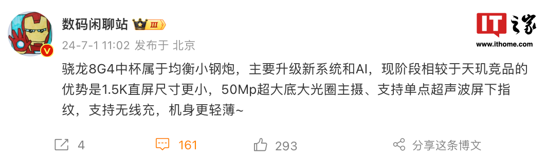 IT之家 7 月 1 日消息,博主 @数码闲聊站今天透露了一款神秘骁龙 & nbsp;8 Gen 4 中杯“均衡小钢炮”新机的规格信息,该机据称相较于天玑竞品的优势是 1.5K 直屏尺寸更小,配备 50MP 超大底大光圈主摄、支持单点超声波屏下指纹,支持无线充,机身更轻薄,同时升级新系统和 AI 功能。