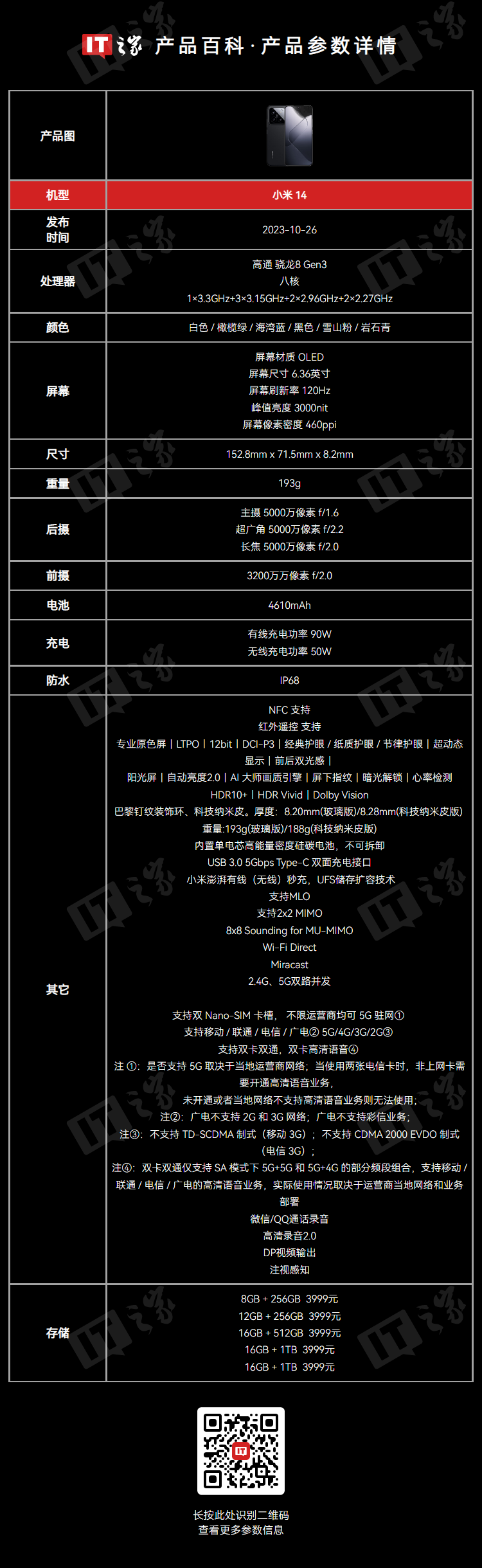 现款小米 14 标准版手机发布于 2023 年 10 月 26 日,售价 3999 元起,该机采用 6.36 英寸 2670×1200 OLED 直屏,最窄 1.61mm 直立边框,搭配圆角设计,可选黑、白、岩石青、雪山粉,四款配色,玻璃版厚 8.20mm 重 193g,纳米皮版厚 8.28mm 重 188g。