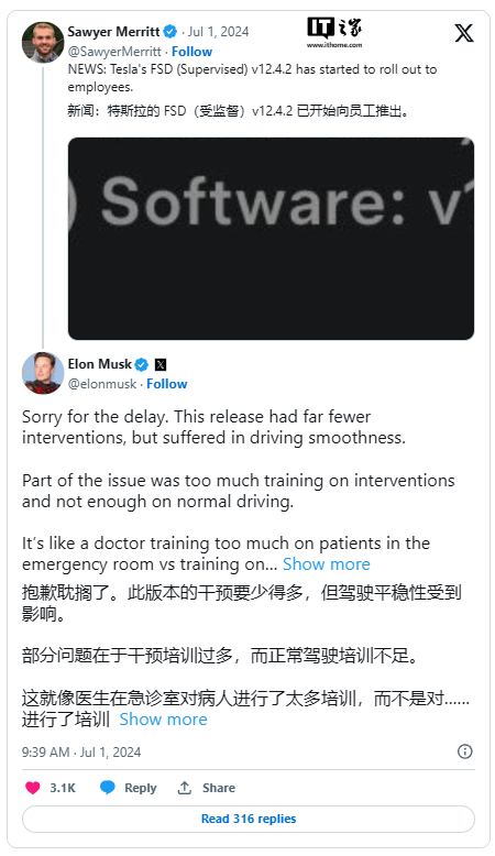 IT之家 7 月 1 日消息,特斯拉首席执行官埃隆・马斯克(Elon Musk)对 FSD V12.4.2 更新进行了说明。据马斯克称,由于 FSD V12.4.2 版本虽然减少了干预次数,但驾驶平顺性仍需改进,因此特斯拉仍在对其进行完善。