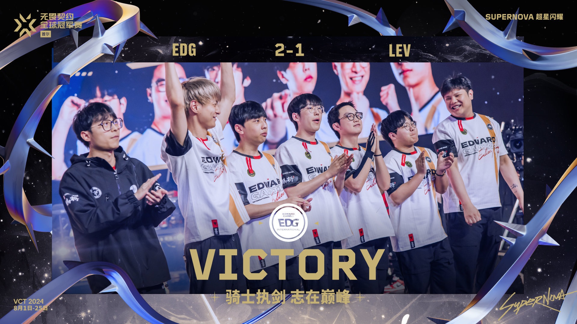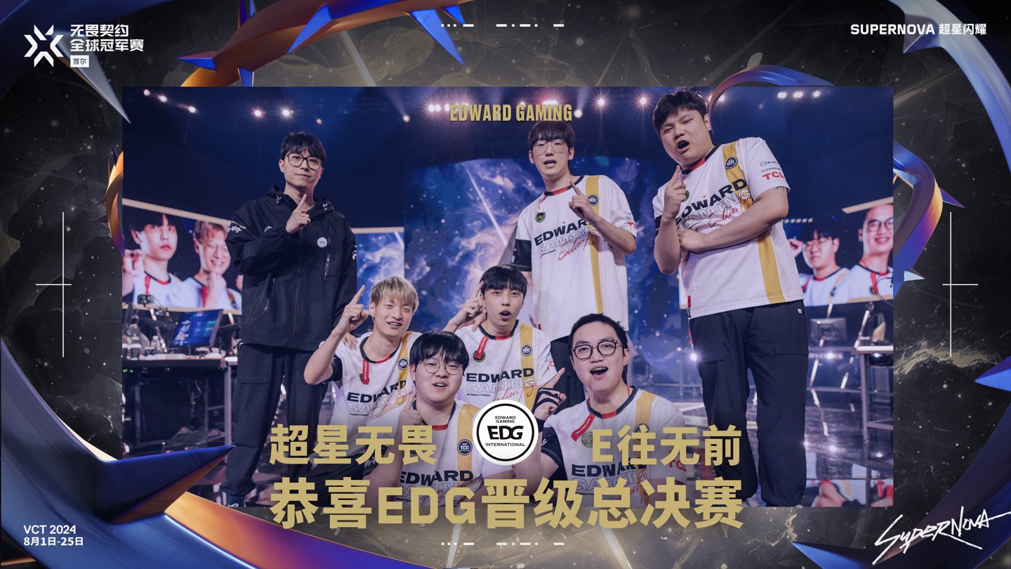 IT之家 8 月 23 日消息,在今日举行的 2024 无畏契约全球冠军赛淘汰赛中,EDG 战队以 2:1 的成绩让一追二赢下美洲联赛的一号种子 LEV 进入总决赛(IT之家注:EDG 也是本赛区一号种子),创造 EDG 队史最佳成绩以及 VCT CN 新的历史纪录,并将代表 CN 赛区争夺本次全球冠军赛冠军奖杯!