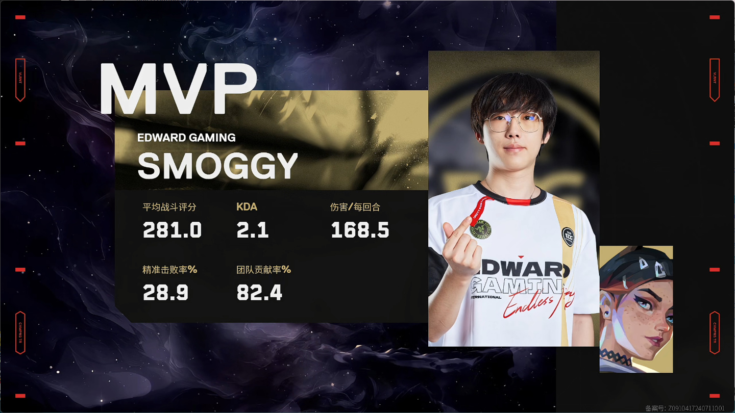 第二局中,EDG 进攻开局,上半场比分为 8:4,下半场换至防守,最终以 13:4 成功赢下,MVP 给到了 Smoggy(张钊)。